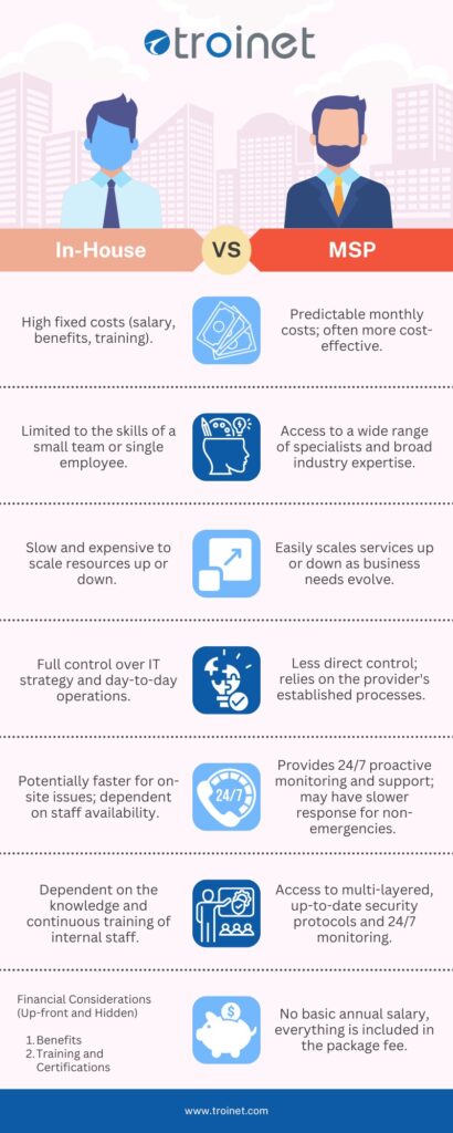 An in-house IT team offers complete control over IT strategy and operations, providing quicker response times for on-site issues and a deep familiarity with the organization’s culture and specific needs. However, this model comes with high fixed costs, including salaries, benefits, and ongoing training, and may lack the broad expertise required to manage complex modern IT environments.